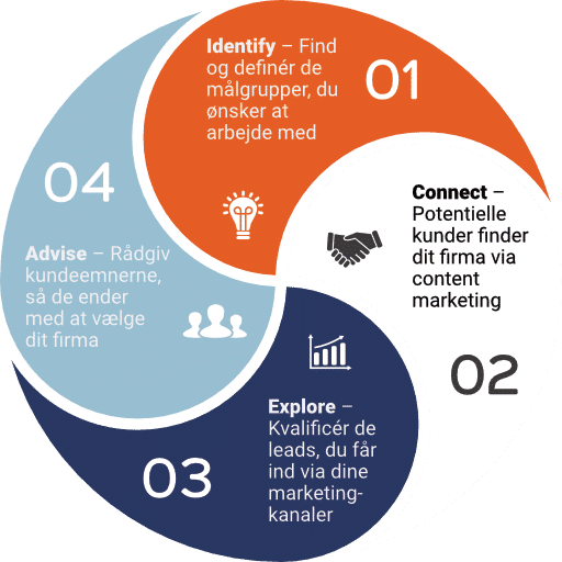 Det er således i denne fase, du får lagt grundstenen til alt dit content marketing-indhold, dine content marketing- og e‑mailmarketing-kampagner og alt det andet indhold, der skal overbevise kunderne om, at dit firma er det rigtige for dem.