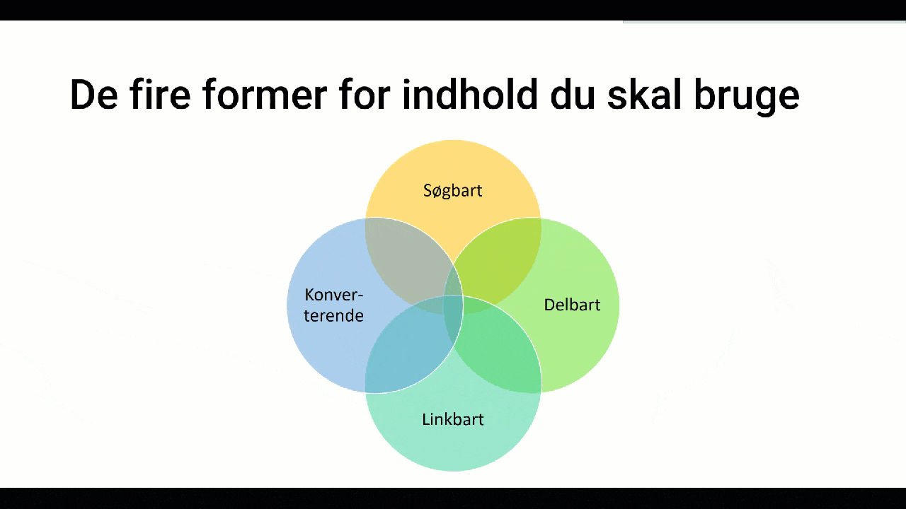Desværre er det ikke alt indhold, der egner sig lige godt til alle fire ting. F.eks. deler folk helst noget visuelt som f.eks. infografik og video på de sociale medier, mens de helst linker til uddybende artikler, der giver mere viden om et emne, de selv berører på deres egen hjemmeside.