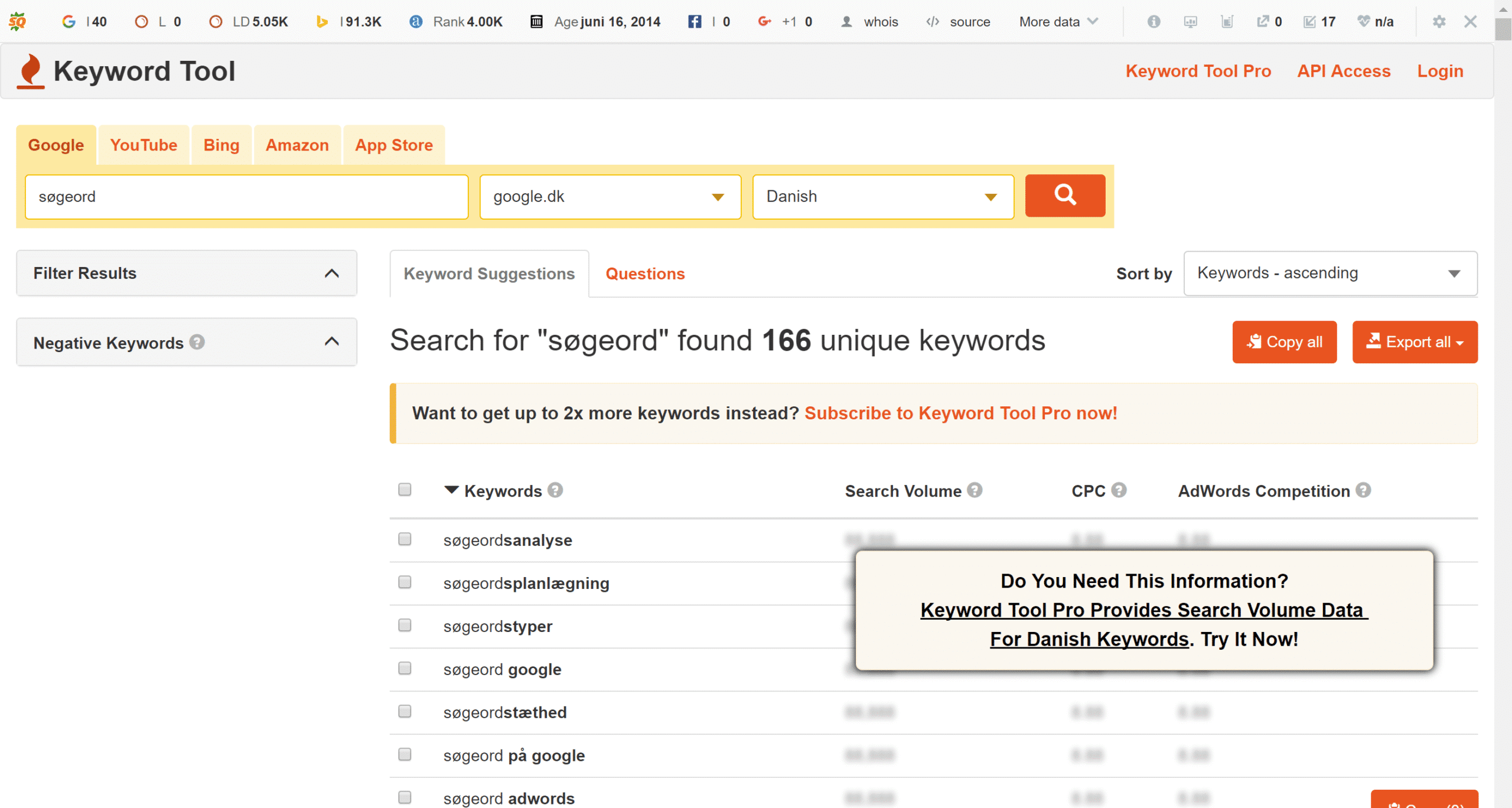 Sådan finder du antal søgninger og søgeordsforslag til hvert søgeord