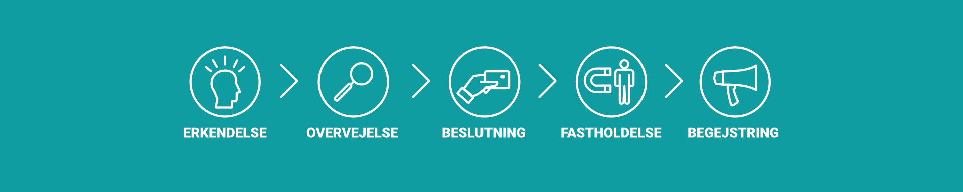 Lad os se nærmere på de trin, der er i den customer journey-model, vi anvender, når vi udvikler indhold til kunderejsen hos os.