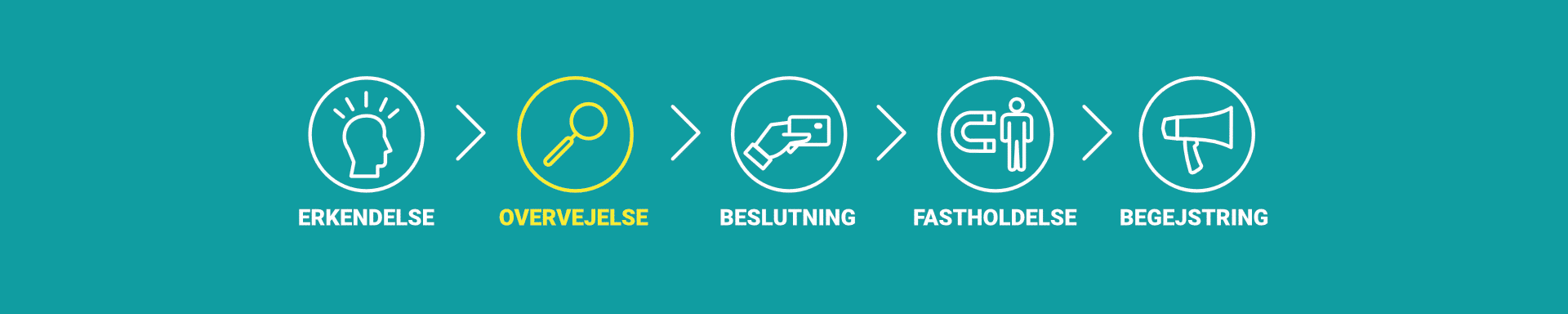 I overvejelsesfasen begynder personaen at blive bevidst om behovet for at få løst den oplevede problemstilling. Hen igennem overvejelsesfasen identificeres så de forskellige konkrete produkter eller ydelser i stil med dem, som du sælger, der kan gøre dette.