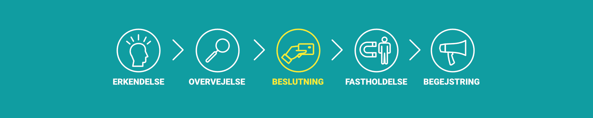 I beslutningsfasen indhenter personaen nærmere oplysninger om priser og de forskellige udbydere eller producenter af de produkter eller ydelser, de har shortlistet under overvejelsesfasen.
