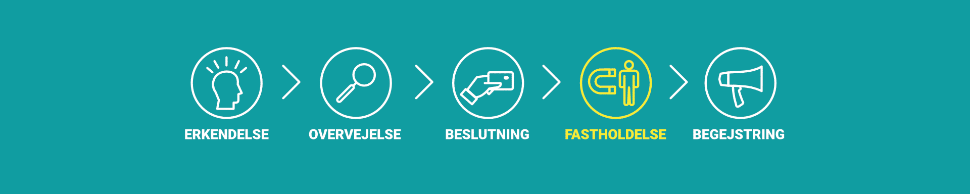 Fastholdelsesfasen er kun relevant for dig, hvis en persona har valgt at købe et af dine produkter eller ydelser. Efter købet er foretaget, kan du målrettet anvende content marketing til at skabe grobund for mersalg og salg af ekstra tilbehør til det købte.