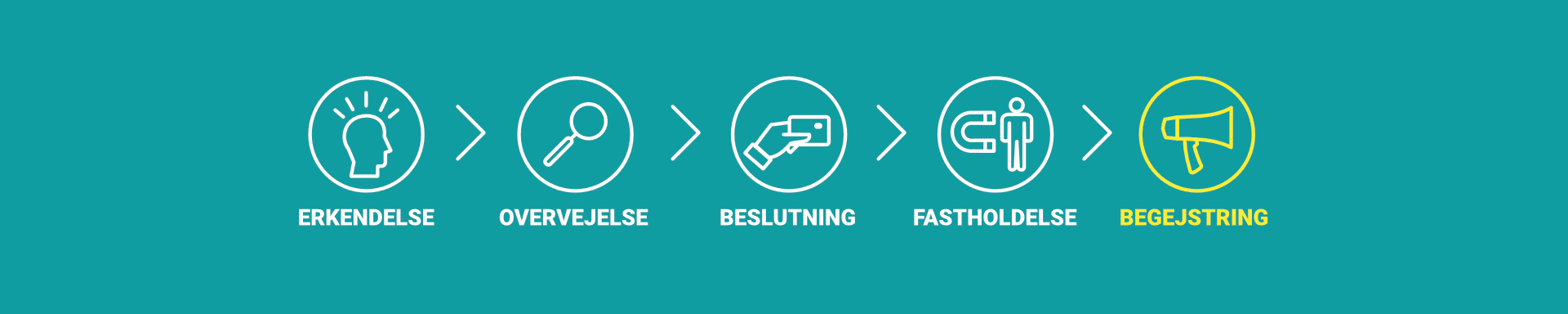 For ved at fortsætte med at begejstre dine kunder med godt indhold efter købet, kan du målrettet arbejde på at transformere dem til deciderede evangelister for dit firma. Derfor indeholder den kunderejse, vi arbejder med hos os, ikke kun de sædvanlige tre første faser, de fleste opdeler kunderejsen i. Den består af hele 5 faser: