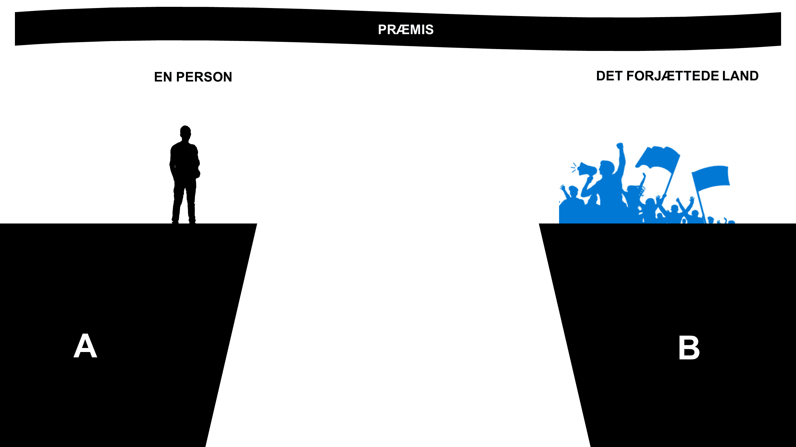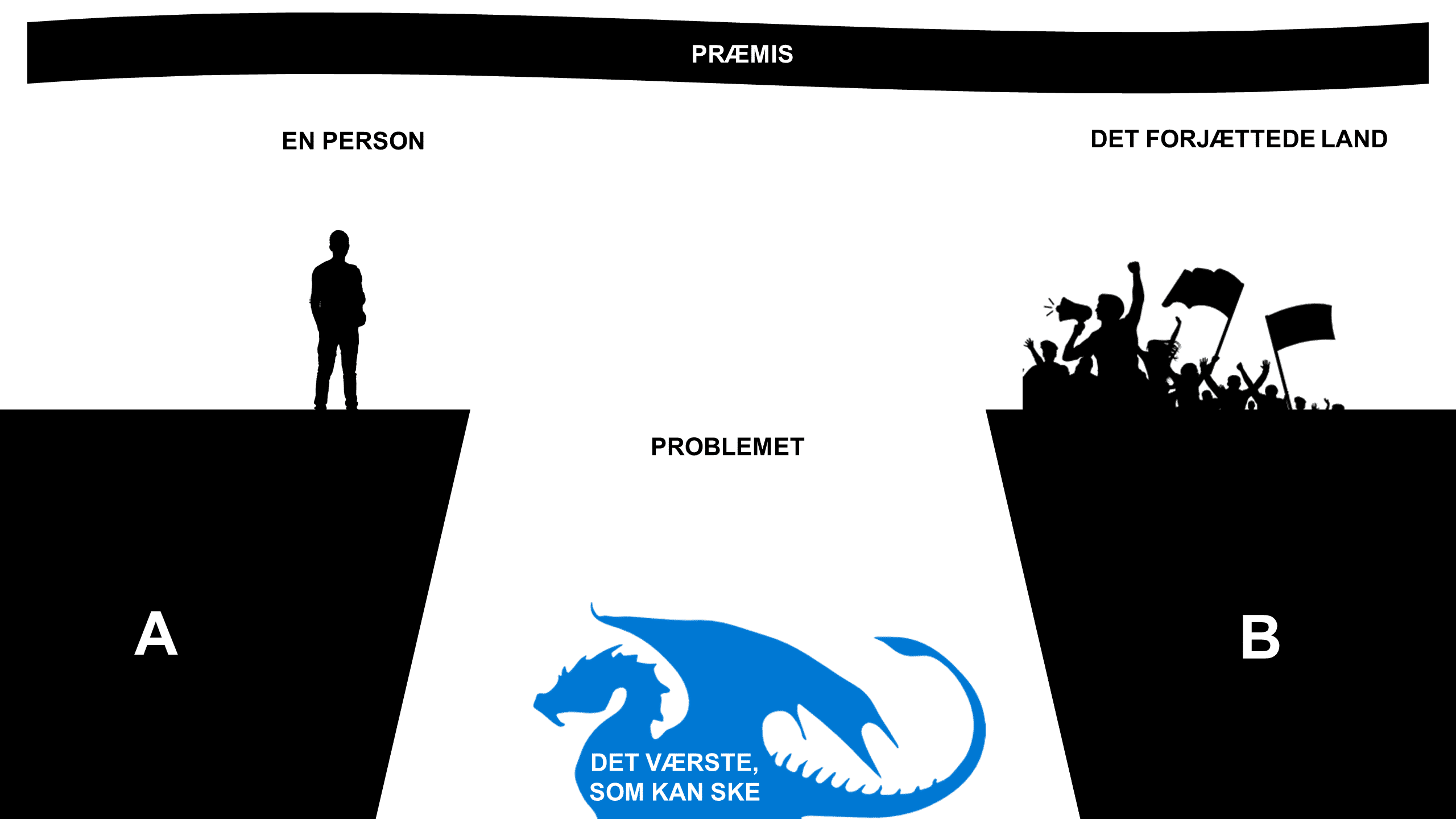 Som sådan er dette ikke en mellemregning, du skal dele med tilhørerne. Den skal være med til at understøtte dit valg af præsentationens præmis, som vi kommer tilbage til lige om lidt. Samtidig kan du med fordel bruge de beskrivende elementer fra både A og B til at visualisere udgangspunktet og det forjættede land. Det er to andre elementer, som vi også kommer tilbage til lige straks.