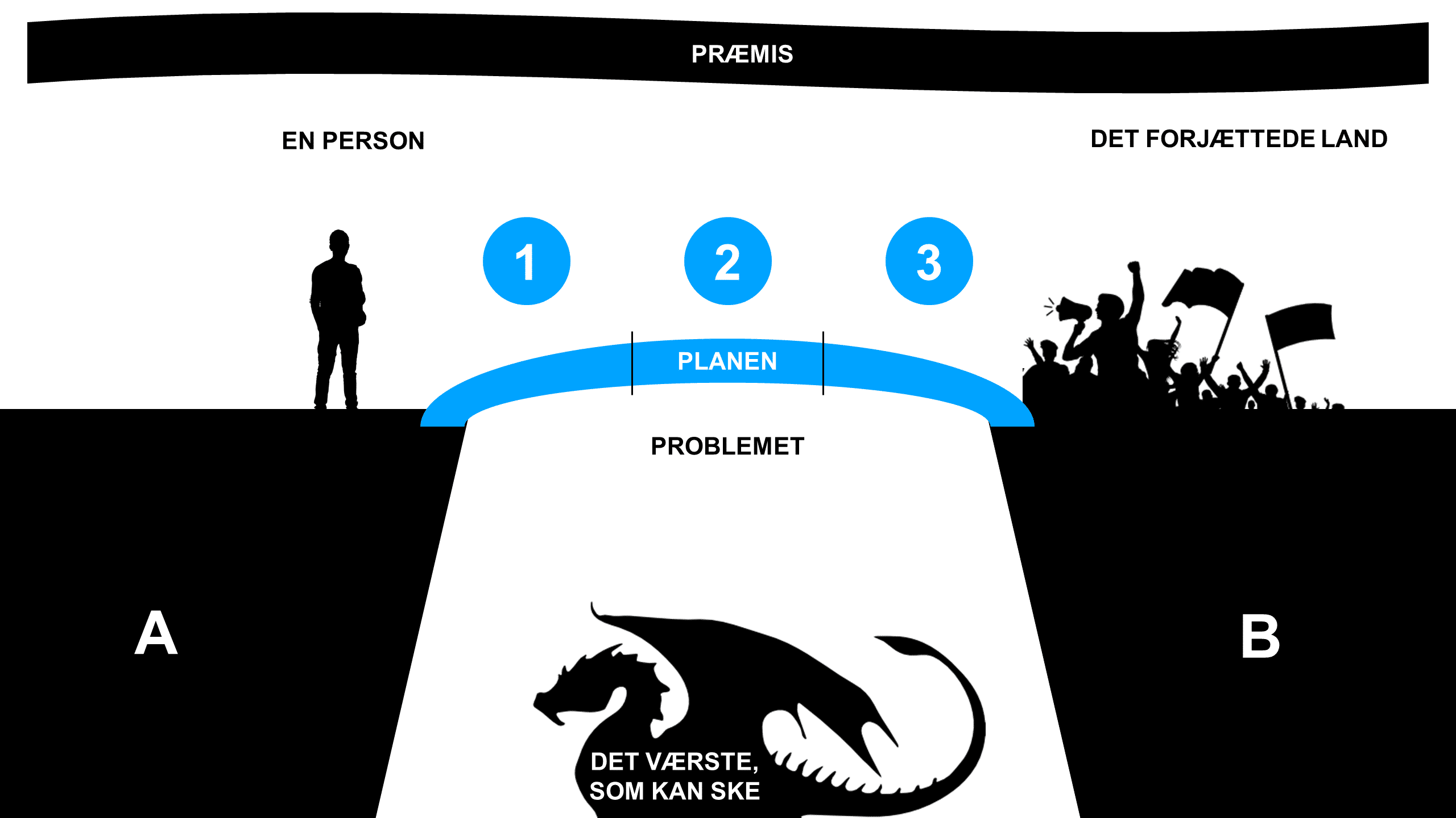Derved slutter hovedpersonen i din præsentation med at komme til det forjættede land over den bro – planen – som du har givet ham eller hende.