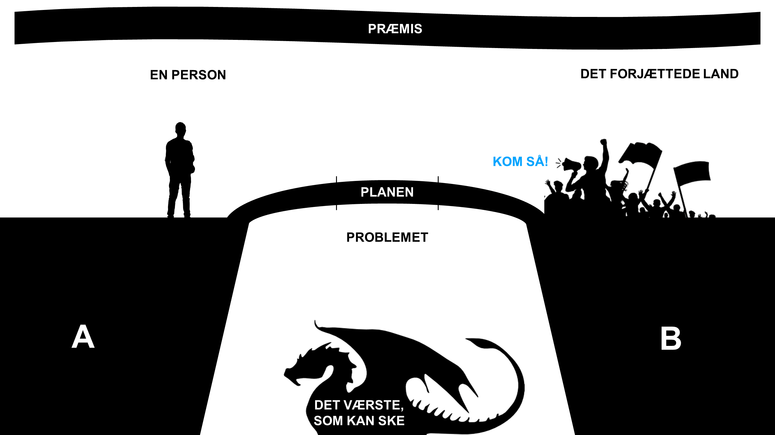 - Kald til handling – guiden opfordrer helten til at gå i gang med at udføre planen, så han eller hun kan opnå sin drøm.