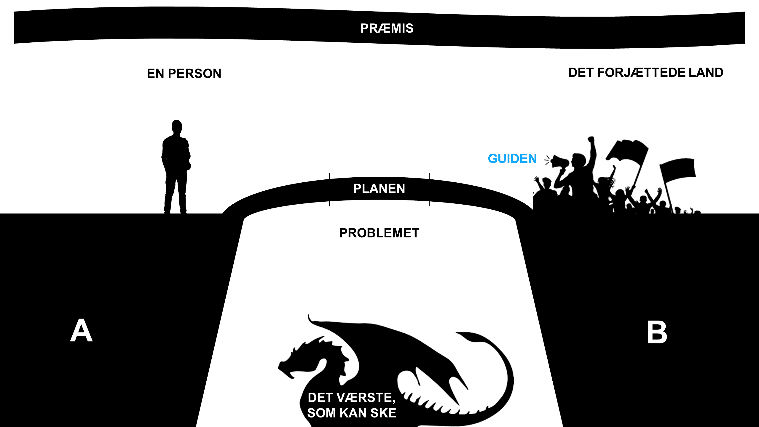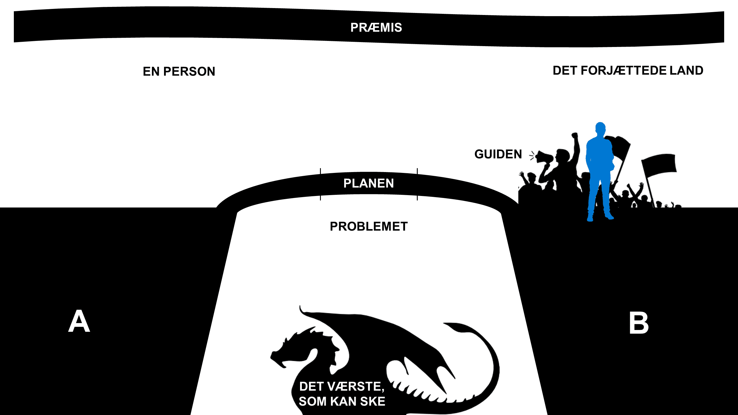 - Løsningen – heldigvis møder helten en guide – dig, som giver præsentationen – som har en plan for løsningen af problemet.