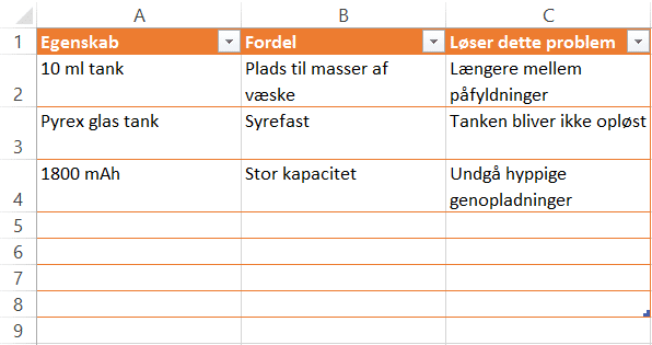 Fyr op under et regneark eller brug en god gammeldags blok og en blyant og byg en tabel, der parer hver enkelt egenskab med de fordele, det giver, hvilke problemer, det løser eller hvordan det gør livet lettere for kunden. Det kunne f.eks. se sådan ud:
