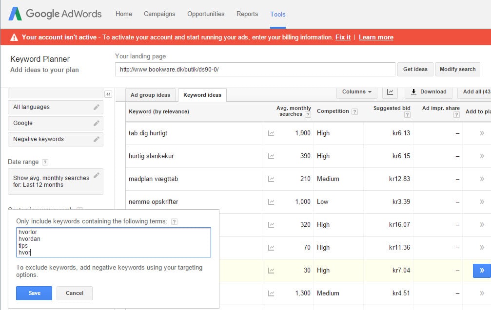 Et godt sted at starte din søgning efter folks spørgsmål og fordomme, er at stoppe webadressen på din produktside ind i Google Keyword Planner og tilføj ”Hvordan”, ”Hvor”, ”Hvorfor”, ”Tips” og lignende ord ind som påkrævede ord. Klik på Foreslåede keywords-fanen og find du ud af, hvilke spørgsmål og forbehold, der dukker op i søgeresultaterne.