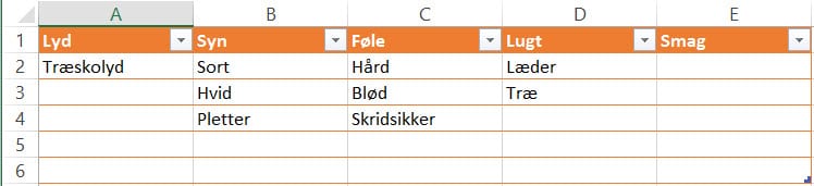 Start med at se på dit produkt og byg en tabel, som den du ser herunder, hvor du beskriver hvordan produktet opfattes af de fem sanser. Hvordan lugter det, smager det, lyder det eller føles det?
