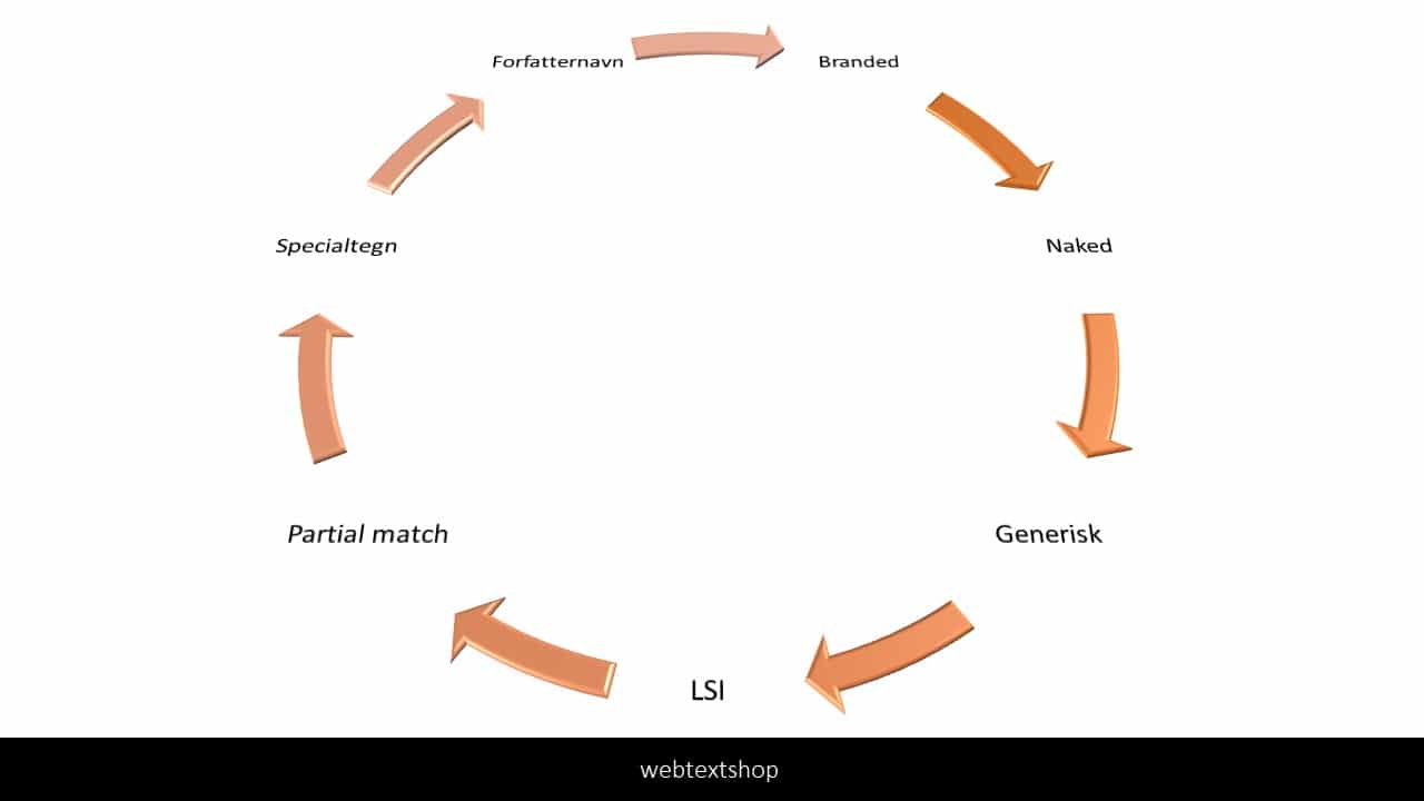 Vil du sikre dig bedst muligt mod at få en straf for over-optimerede links, skal du altså sørge for at anvende en bred vifte af de forskellige former for ankertekster, der findes. Vi har samlet en række forskellige former for ankertekster, du kan skifte imellem. De forskellige former for ankertekster er enten unikke, en variant af phrase match eller består af en kombination af to eller flere andre varianter af ankertekster.