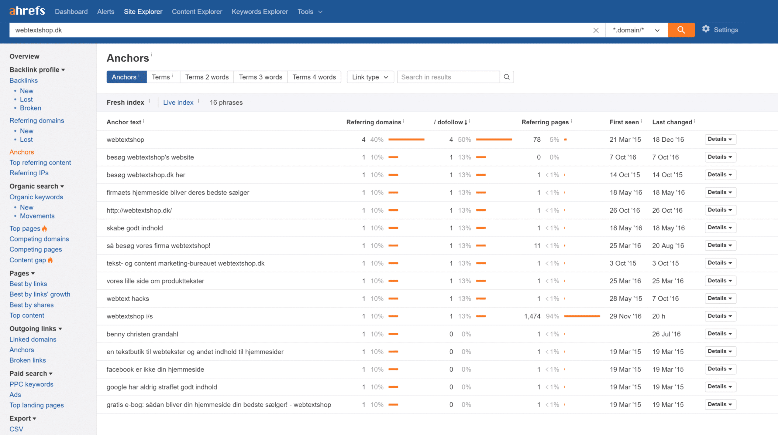 Som du kan se i eksemplet herunder, har vi flest Branded ankertekster til webtextshops hjemmeside, samt et par enkelte phrase match ankertekster og en del generiske ankertekster. Ikke en fordeling af ankertekster, der burde give anledning til problemer med Googles Penguin-algoritme.