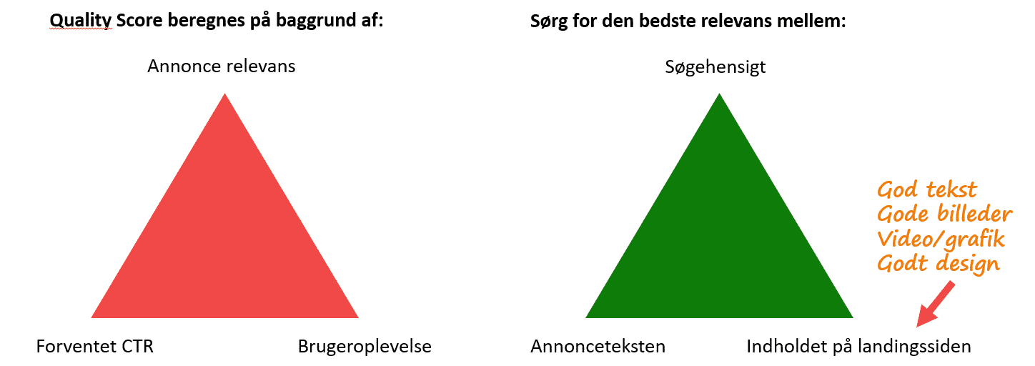 Quality Score beregnes ud fra annoncetekstens relevans i forhold til søgehensigten, den forventede Click-Trough Rate og brugeroplevelsen på landingssiden.